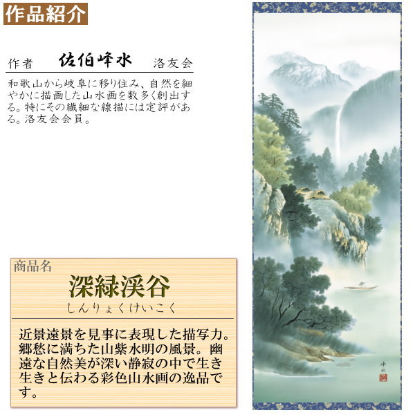 正絹 掛け軸 彩色山水 年中掛け 佐伯峰水 深緑渓谷 正絹緞子本表装 尺5 桐箱入 1個 日本製 送料無料 名画複製 山水画 掛軸 年中飾り 普段掛け 高級感 インテリア 壁掛け リビング 和室 床の間 飾り 敬老の日 おじいちゃん 誕生日 お祝い 贈り物 ギフト プレゼント